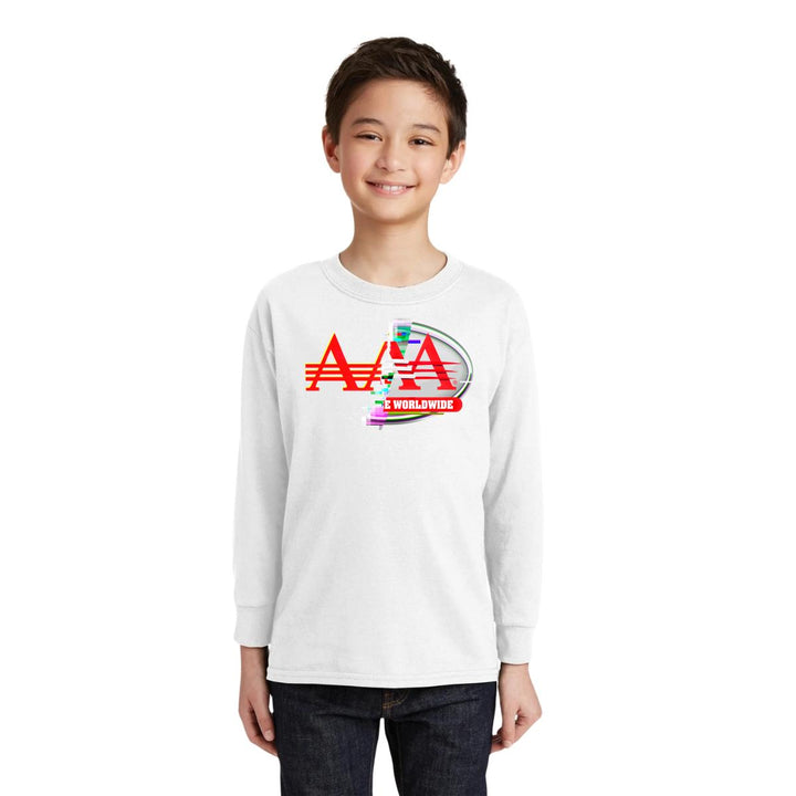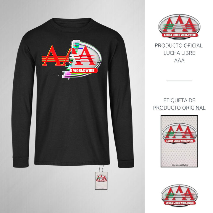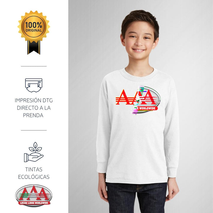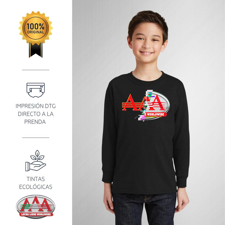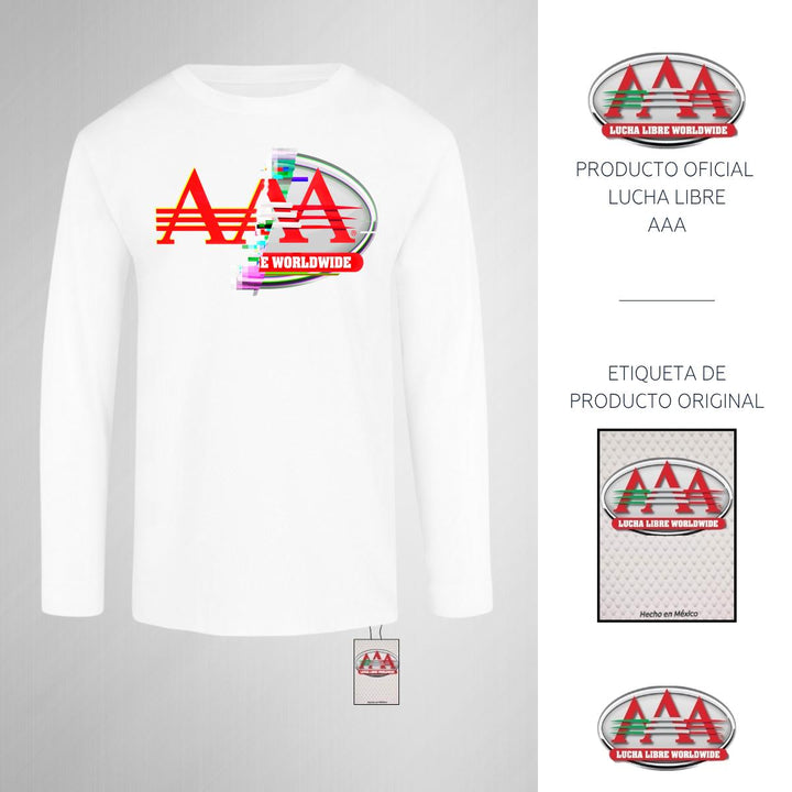 Playera infantil manga larga, cuello redondo para niño o niña nueva Lucha Libre AAA oficial, diseño Glitch original impreso con tecnología DTG (directo a la prenda) tacto cero, uso casual o deportiva, 100% algodón, estructura tubular sin costuras laterales. Colores de camiseta: Negro, Blanco.