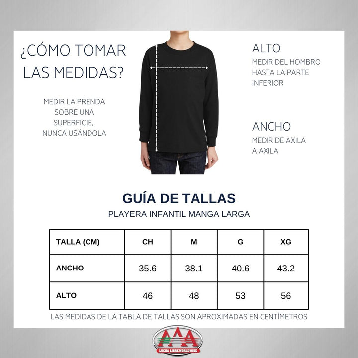 • ORIGINALIDAD Y SOSTENIBILIDAD: Playera infantil de manga larga. Producto Oficial con un diseño original de Lucha Libre AAA impreso con tecnología DTG (directo a la prenda) tacto cero. Se utilizan tintas ecológicas sin contaminantes que se adhieren a las fibras de la ropa, garantizando calidad, colores vivos e imagen de larga duración en la camiseta sin comprometer el planeta. La playera cuenta además con etiqueta que garantiza un producto 100% original de Lucha Libre AAA.