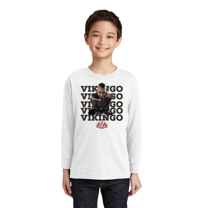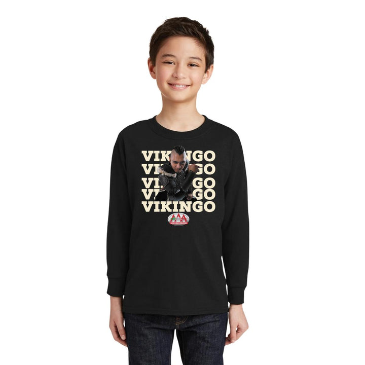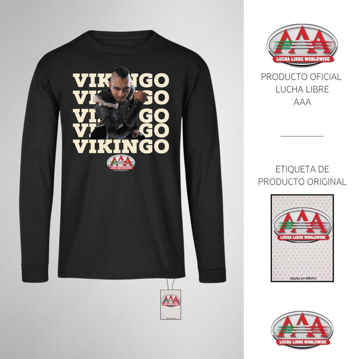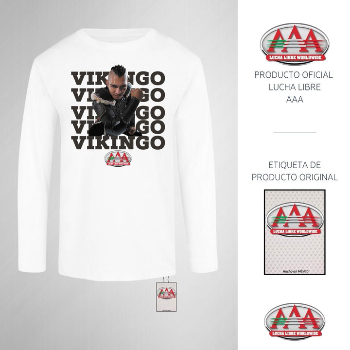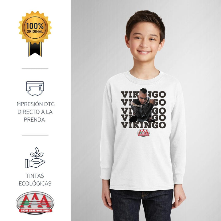 Playera infantil manga larga, cuello redondo para niño o niña nueva Lucha Libre AAA oficial, diseño Hijo del Vikingo original impreso con tecnología DTG (directo a la prenda) tacto cero, uso casual o deportiva, 100% algodón, estructura tubular sin costuras laterales. Colores de camiseta: Negro, Blanco.