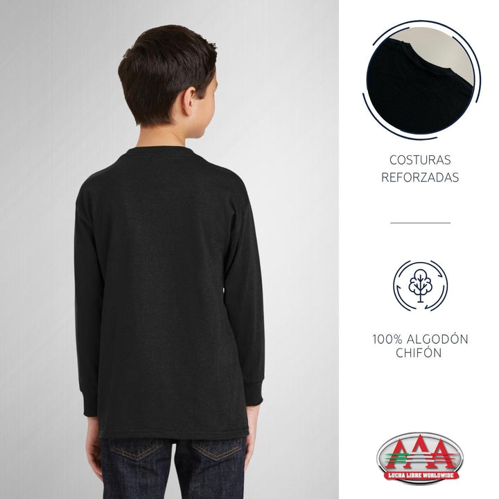 - ORIGINALIDAD Y SOSTENIBILIDAD: Playera infantil de manga larga. Producto Oficial con un diseño original de Lucha Libre AAA impreso con tecnología DTG (directo a la prenda) tacto cero. Se utilizan tintas ecológicas sin contaminantes que se adhieren a las fibras de la ropa, garantizando calidad, colores vivos e imagen de larga duración en la camiseta sin comprometer el planeta. La playera cuenta además con etiqueta que garantiza un producto 100% original de Lucha Libre AAA.