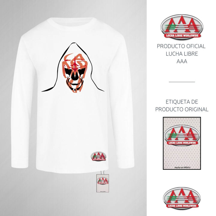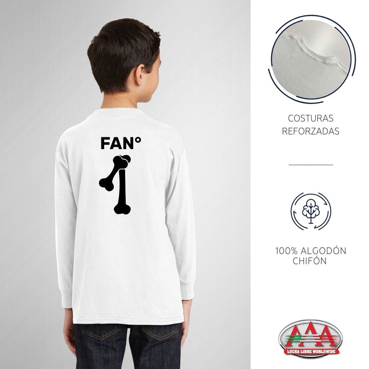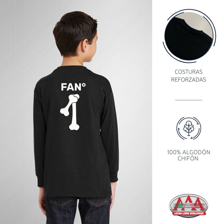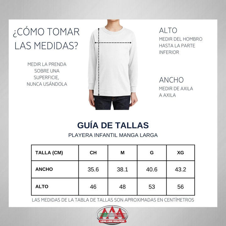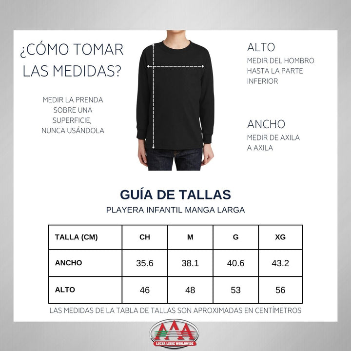 Playera infantil manga larga, cuello redondo para niño o niña nueva Lucha Libre AAA oficial, diseño La Parka 1 Fan original impreso con tecnología DTG (directo a la prenda) tacto cero, uso casual o deportiva, 100% algodón, estructura tubular sin costuras laterales. Colores de camiseta: Negro, Blanco.