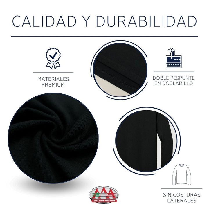 • ORIGINALIDAD Y SOSTENIBILIDAD: Playera infantil de manga larga. Producto Oficial con un diseño original de Lucha Libre AAA impreso con tecnología DTG (directo a la prenda) tacto cero. Se utilizan tintas ecológicas sin contaminantes que se adhieren a las fibras de la ropa, garantizando calidad, colores vivos e imagen de larga duración en la camiseta sin comprometer el planeta. La playera cuenta además con etiqueta que garantiza un producto 100% original de Lucha Libre AAA.