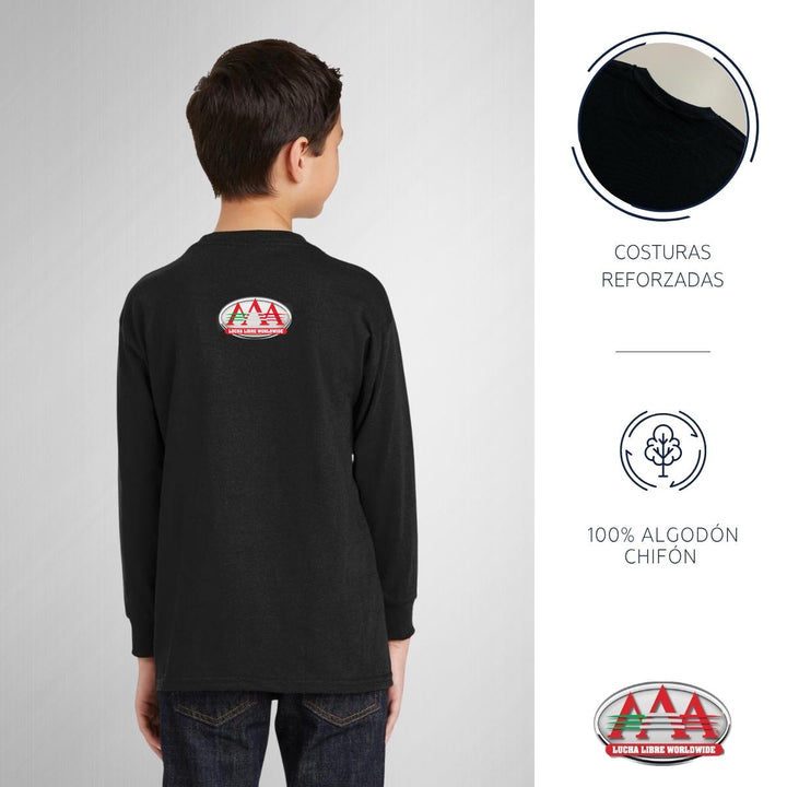 - ORIGINALIDAD Y SOSTENIBILIDAD: Playera infantil de manga larga. Producto Oficial con un diseño original de Lucha Libre AAA impreso con tecnología DTG (directo a la prenda) tacto cero. Se utilizan tintas ecológicas sin contaminantes que se adhieren a las fibras de la ropa, garantizando calidad, colores vivos e imagen de larga duración en la camiseta sin comprometer el planeta. La playera cuenta además con etiqueta que garantiza un producto 100% original de Lucha Libre AAA.