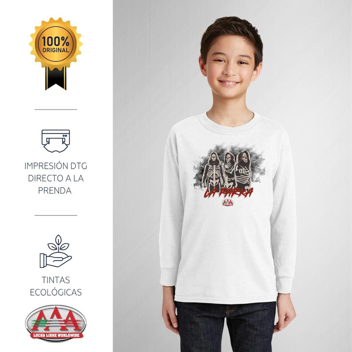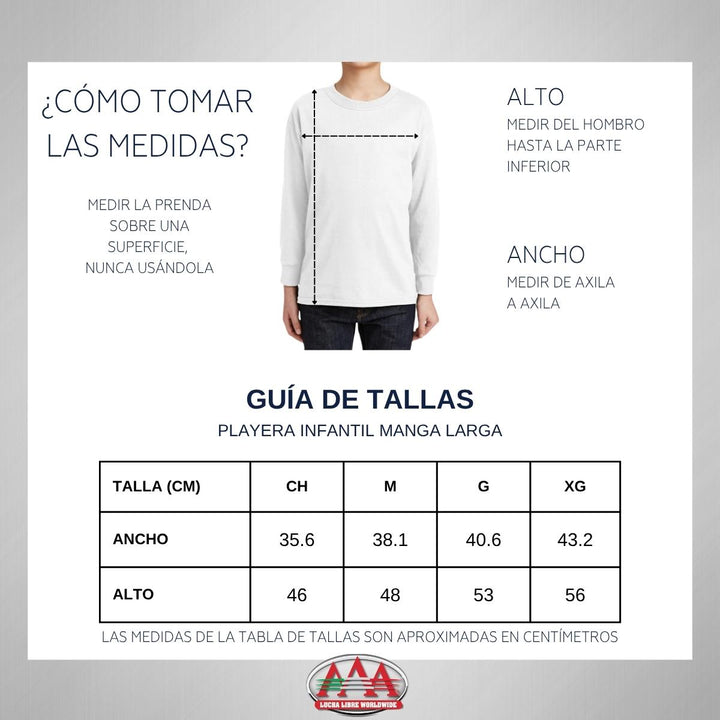 Playera infantil manga larga, cuello redondo para niño o niña nueva Lucha Libre AAA oficial, diseño La Parka Luchador original impreso con tecnología DTG (directo a la prenda) tacto cero, uso casual o deportiva, 100% algodón, estructura tubular sin costuras laterales. Colores de camiseta: Negro, Blanco.