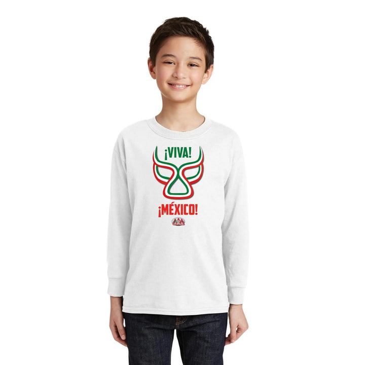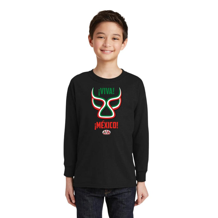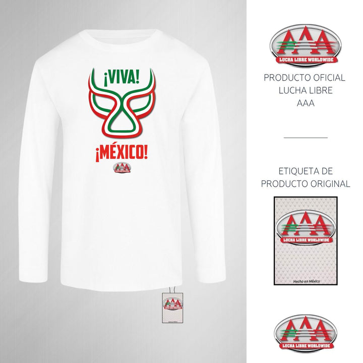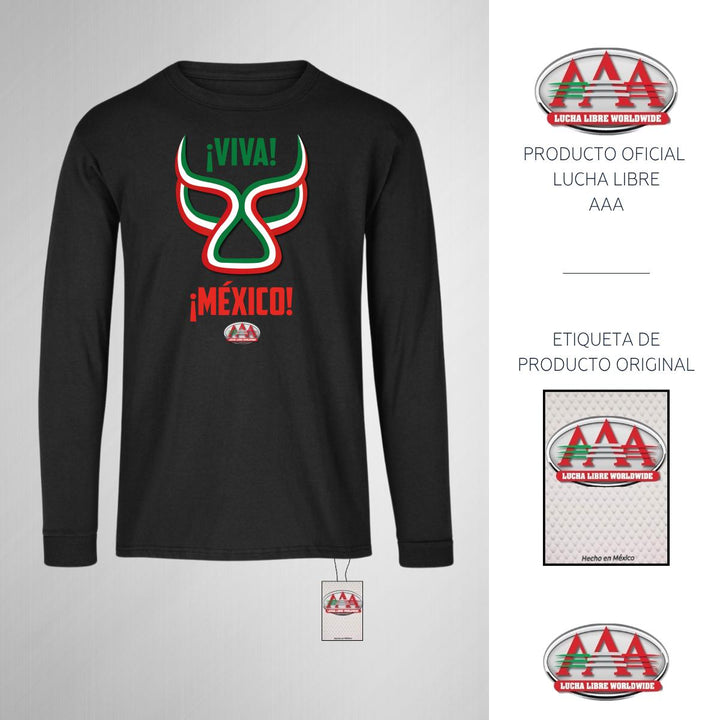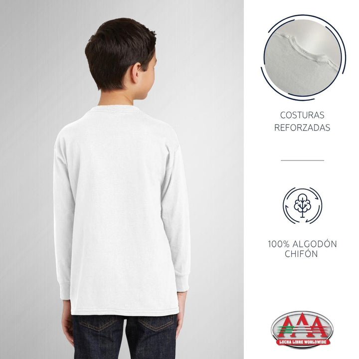Playera infantil manga larga, cuello redondo para niño o niña nueva Lucha Libre AAA oficial, diseño Mexicana Máscara original impreso con tecnología DTG (directo a la prenda) tacto cero, uso casual o deportiva, 100% algodón, estructura tubular sin costuras laterales. Colores de camiseta: Negro, Blanco.