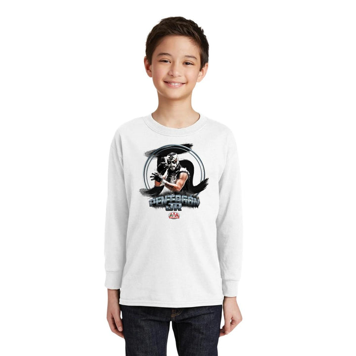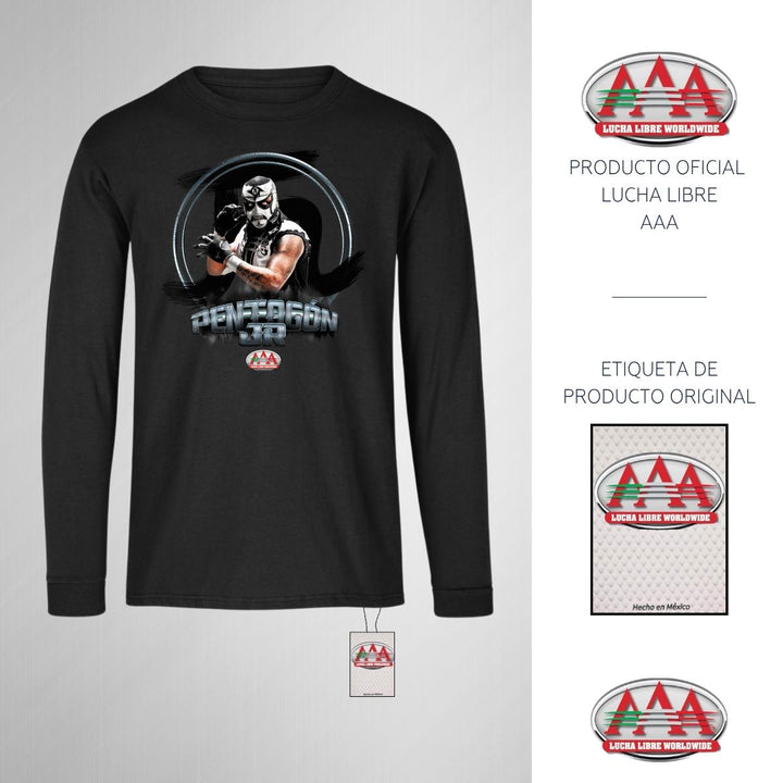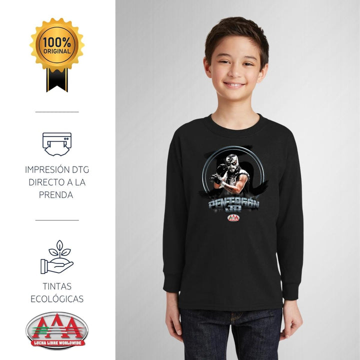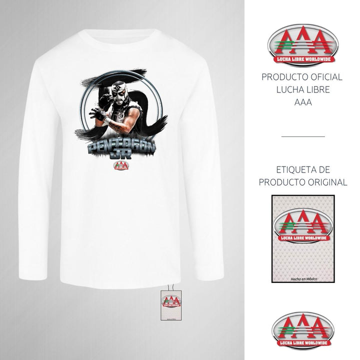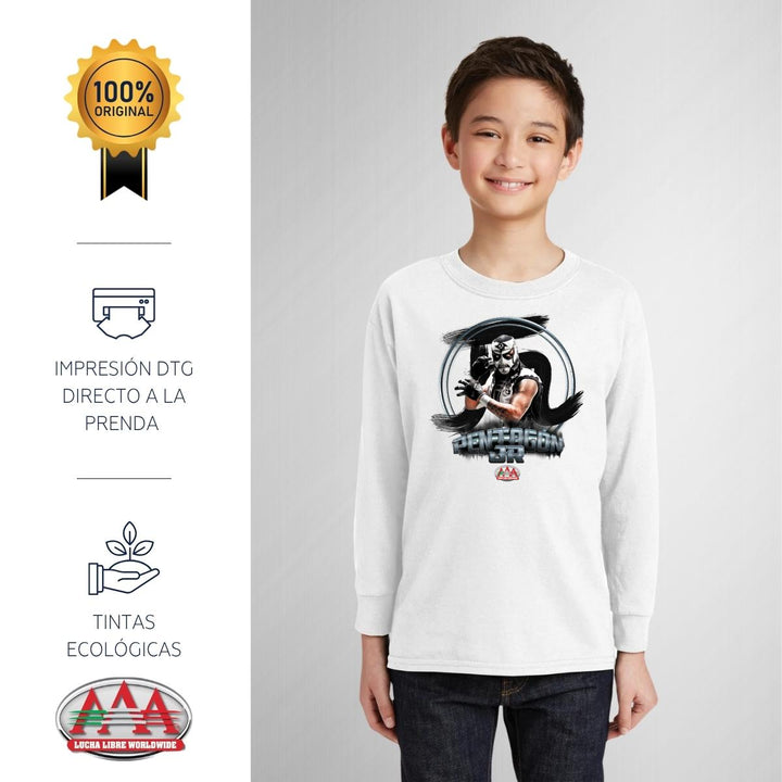 Playera infantil manga larga, cuello redondo para niño o niña nueva Lucha Libre AAA oficial, diseño Pentagón Jr original impreso con tecnología DTG (directo a la prenda) tacto cero, uso casual o deportiva, 100% algodón, estructura tubular sin costuras laterales. Colores de camiseta: Negro, Blanco.