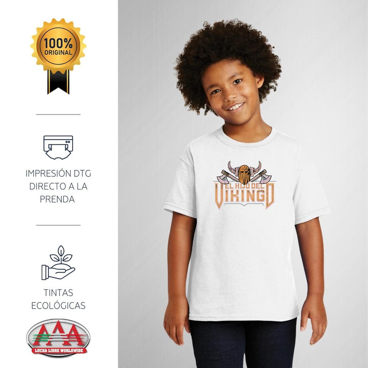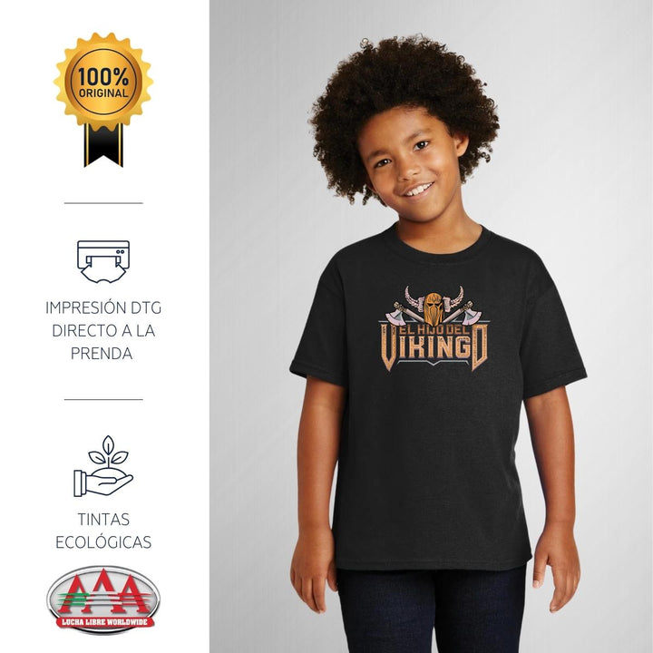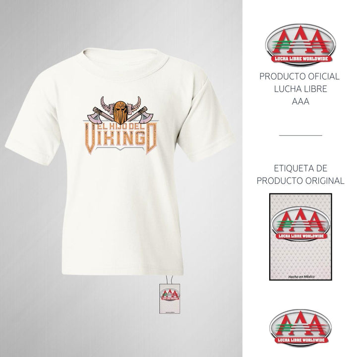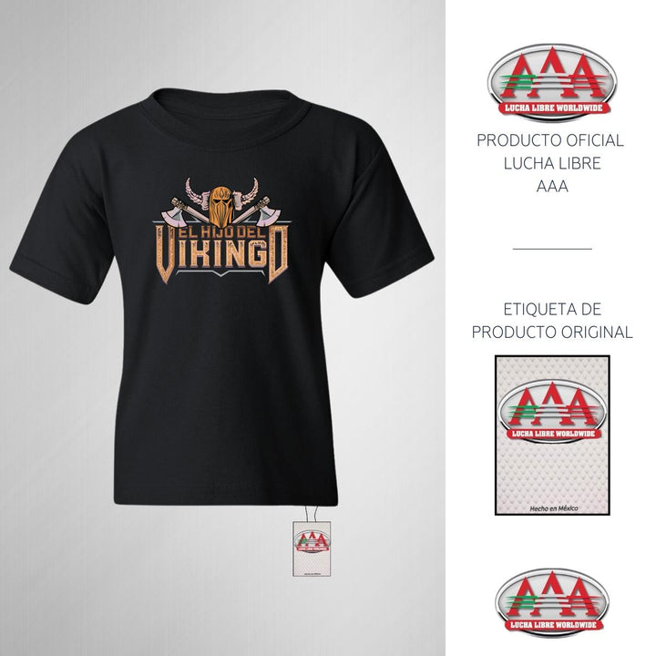 Playera infantil manga corta, cuello redondo para niño o niña nueva Lucha Libre AAA oficial, diseño WWE El Hijo del Vikingo original impreso con tecnología DTG (directo a la prenda) tacto cero, uso casual o deportiva, 100% algodón chifón pre encogido, estructura tubular sin costuras laterales. Colores de camiseta: Negro, Blanco.