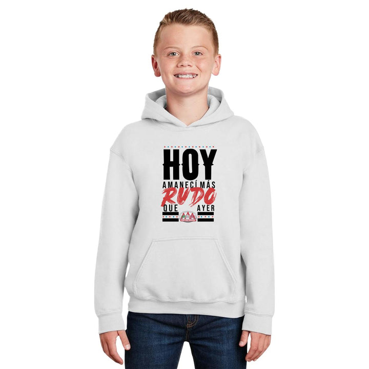 Sudadera hoodie infantil con gorro o capucha y bolsillo frontal canguro nueva, para niño o niña, Lucha Libre AAA oficial, diseño Amanecí Más Rudo original impreso con tecnología DTG (directo a la prenda) tacto cero, uso casual o deportiva, 50% algodón y 50% poliéster fleece pre encogido, estructura tubular con ajuste clásico. Colores de sudadera: Blanco, Gris.