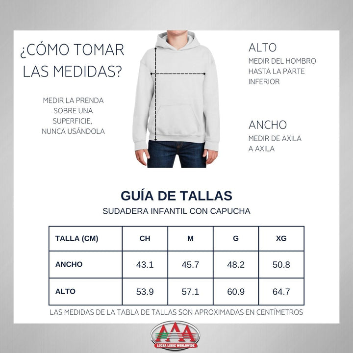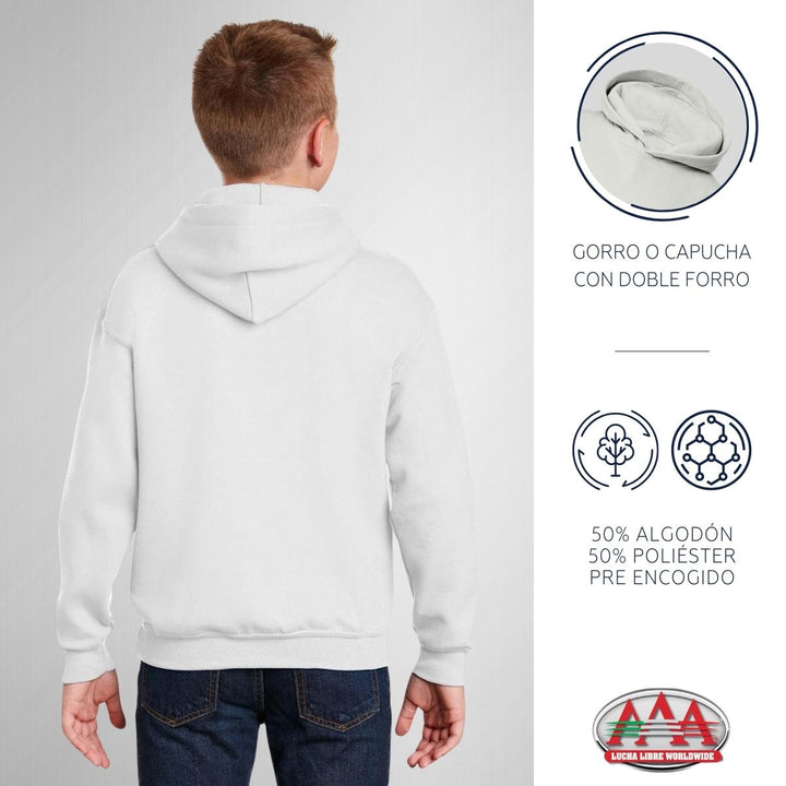 - ORIGINALIDAD Y SOSTENIBILIDAD: Sudadera infantil con capucha. Producto Oficial con un diseño original de Lucha Libre AAA impreso con tecnología DTG (directo a la prenda) tacto cero. Se utilizan tintas ecológicas sin contaminantes que se adhieren a las fibras de la ropa, garantizando calidad, colores vivos e imagen de larga duración en la sudadera sin comprometer el planeta. La sudadera cuenta con etiqueta y holograma que garantiza un producto 100% original de Lucha Libre AAA.