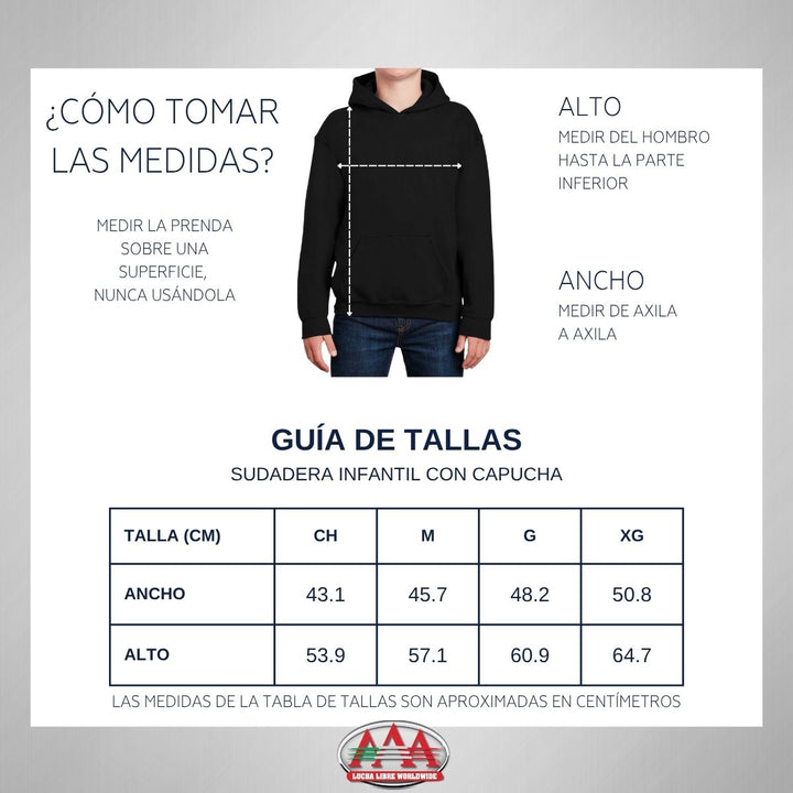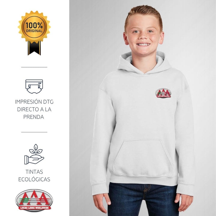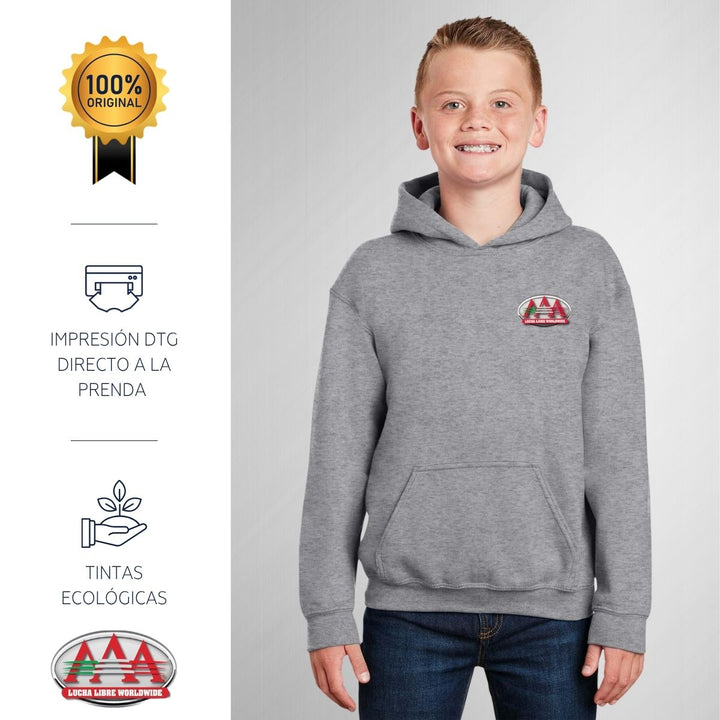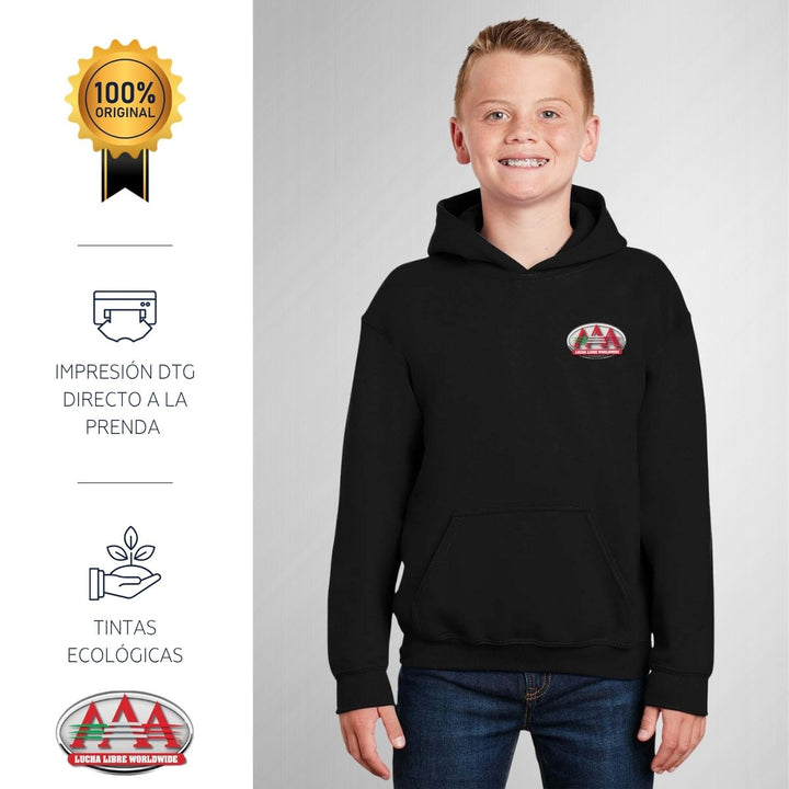 - ORIGINALIDAD Y SOSTENIBILIDAD: Sudadera infantil con capucha. Producto Oficial con un diseño original de Lucha Libre AAA impreso con tecnología DTG (directo a la prenda) tacto cero. Se utilizan tintas ecológicas sin contaminantes que se adhieren a las fibras de la ropa, garantizando calidad, colores vivos e imagen de larga duración en la sudadera sin comprometer el planeta. La sudadera cuenta con etiqueta y holograma que garantiza un producto 100% original de Lucha Libre AAA.