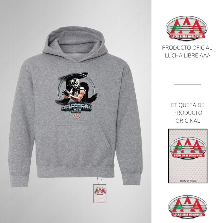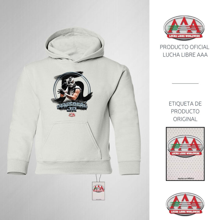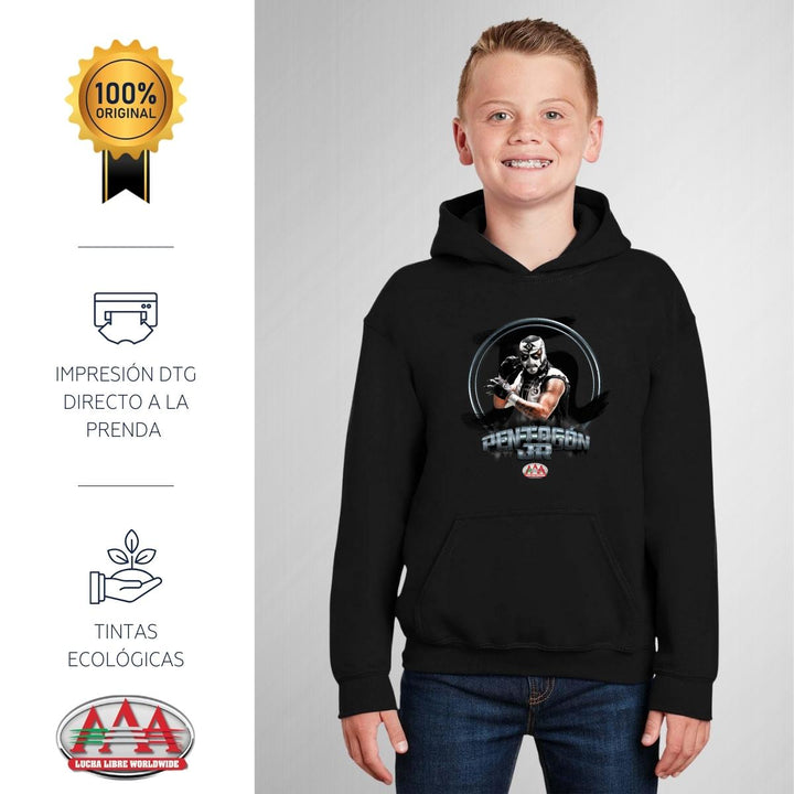 Sudadera hoodie infantil con gorro o capucha y bolsillo frontal canguro nueva, para niño o niña, Lucha Libre AAA oficial, diseño Pentagón Jr original impreso con tecnología DTG (directo a la prenda) tacto cero, uso casual o deportiva, 50% algodón y 50% poliéster fleece pre encogido, estructura tubular con ajuste clásico. Colores de sudadera: Negro, Blanco, Gris.