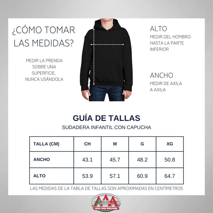 • ORIGINALIDAD Y SOSTENIBILIDAD: Sudadera infantil con capucha. Producto Oficial con un diseño original de Lucha Libre AAA impreso con tecnología DTG (directo a la prenda) tacto cero. Se utilizan tintas ecológicas sin contaminantes que se adhieren a las fibras de la ropa, garantizando calidad, colores vivos e imagen de larga duración en la sudadera sin comprometer el planeta. La sudadera cuenta con etiqueta y holograma que garantiza un producto 100% original de Lucha Libre AAA.